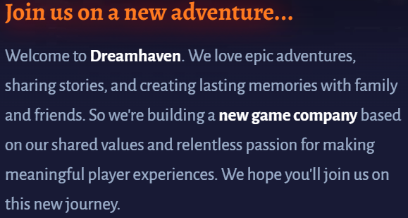 在公司页面的官网,有这么一段介绍:我们喜欢史诗般的冒险,分享故事,并与家人和朋友创造持久的回忆。因此,基于我们共同的价值观和对创造有意义的玩家体验的不懈热情,我们正在建立一家新的游戏公司。我们希望您能加入我们的新旅程。