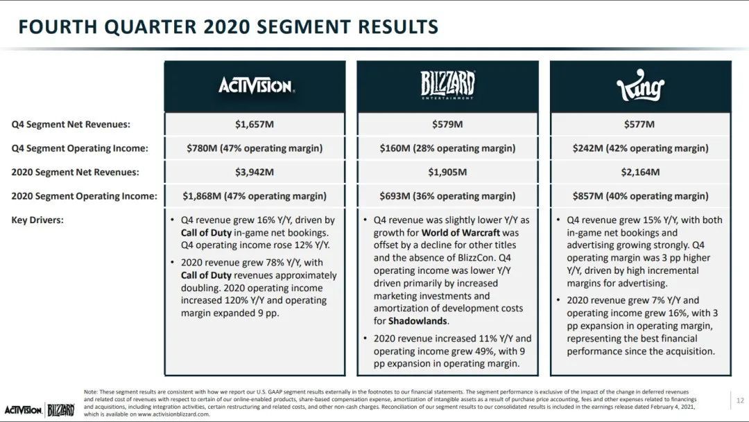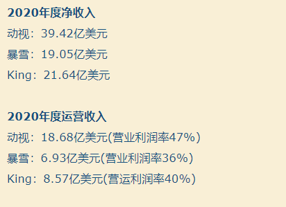 可问题在于,暴雪的盈利和增长始终是不如动视的。所以在合并后,暴雪是一直处于弱势一方,这一点从它们的财报中就能看得出来。整个 2020 年动视暴雪净收入 80.9 亿美元,其中动视 39.42 亿美元,盈业利润率 47 %,暴雪 19.05 亿美元,盈业利润率 36 %