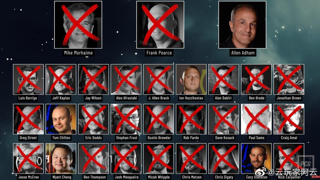 网络上有一张很有意思的图,这张图上面显示是所有暴雪的高层管理,被打红叉的则是表示已离职。 三位创始人中,除了 Allen Adham 在离职十几年后,于 2016 年回归。Mike Morhaime 已经于 2019 年 4 月离开暴雪。Frank Pearce于 2019 年 7 月离开。