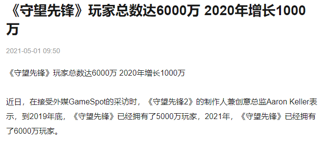 在 2016 年出品的守望先锋,即使到了 2020 年玩家增长也突破了 1000 万,至今玩家总数已达 6000 万,以此为基础的电竞联赛 OWL 更是有过一个联赛席位卖出 6000 万美元的高价,相比传统体育也不遑多让。