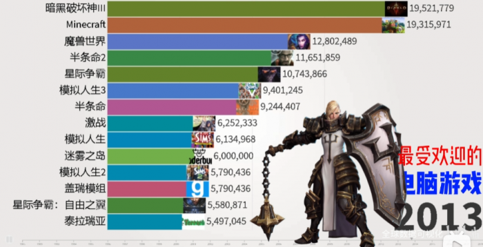 有一个UP做了一个全球数据 可视化视频,统计了 1985 年到 2019 年的 PC 游戏销量。从视频画面来看,说暴雪的游戏占据了半壁江山应该是一点都不过份吧。