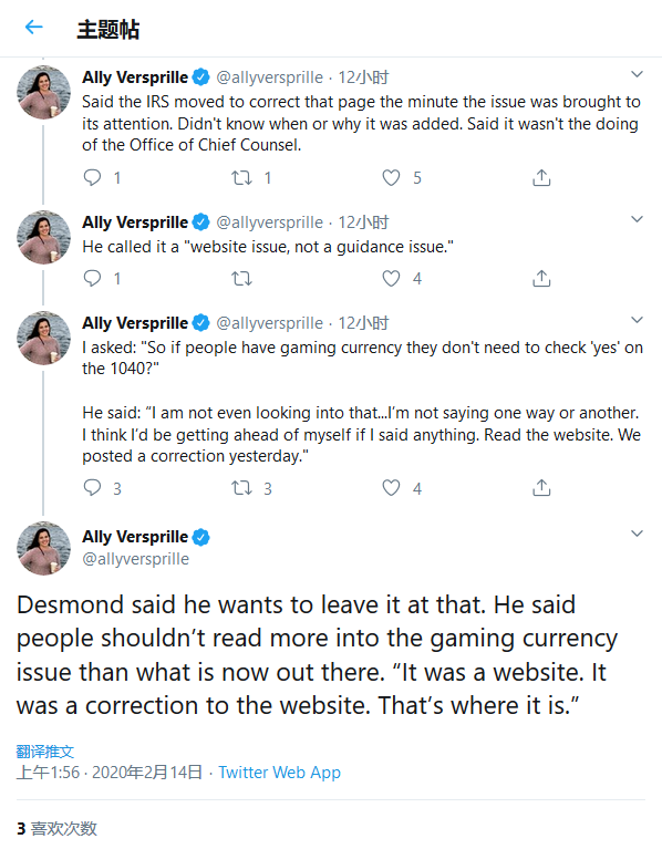 IRS首席法律顾问迈克尔·戴斯蒙德(Michael Desmond)今天对记者说,“这个问题已得到纠正,并且很快得到解决。”尽管如此,但国税局并未明确免除它们的举报责任。CNN文章作者莱恩·冯(Brian Fung)认为,这可能意味着您仍然需要报告这些情况。