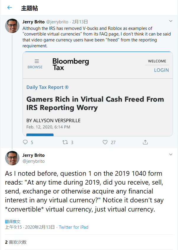 根据美国国税局的定义,可转换虚拟货币视为具备对等价值或者可以替代真实货币的一种虚拟货币。美国国税局将视频游戏虚拟货币纳入显然是一个错误。 在经报道之后,美国国税局(IRS)网站现在仅将比特币列为可转换虚拟货币的示例。
