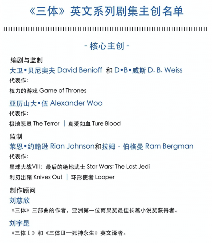 David Benioff和D.B. Weiss称,《三体》是他们所读过的最雄心勃勃的科幻系列,他们期待着用未来几年时间将其拍成剧集,献给全世界观众。
