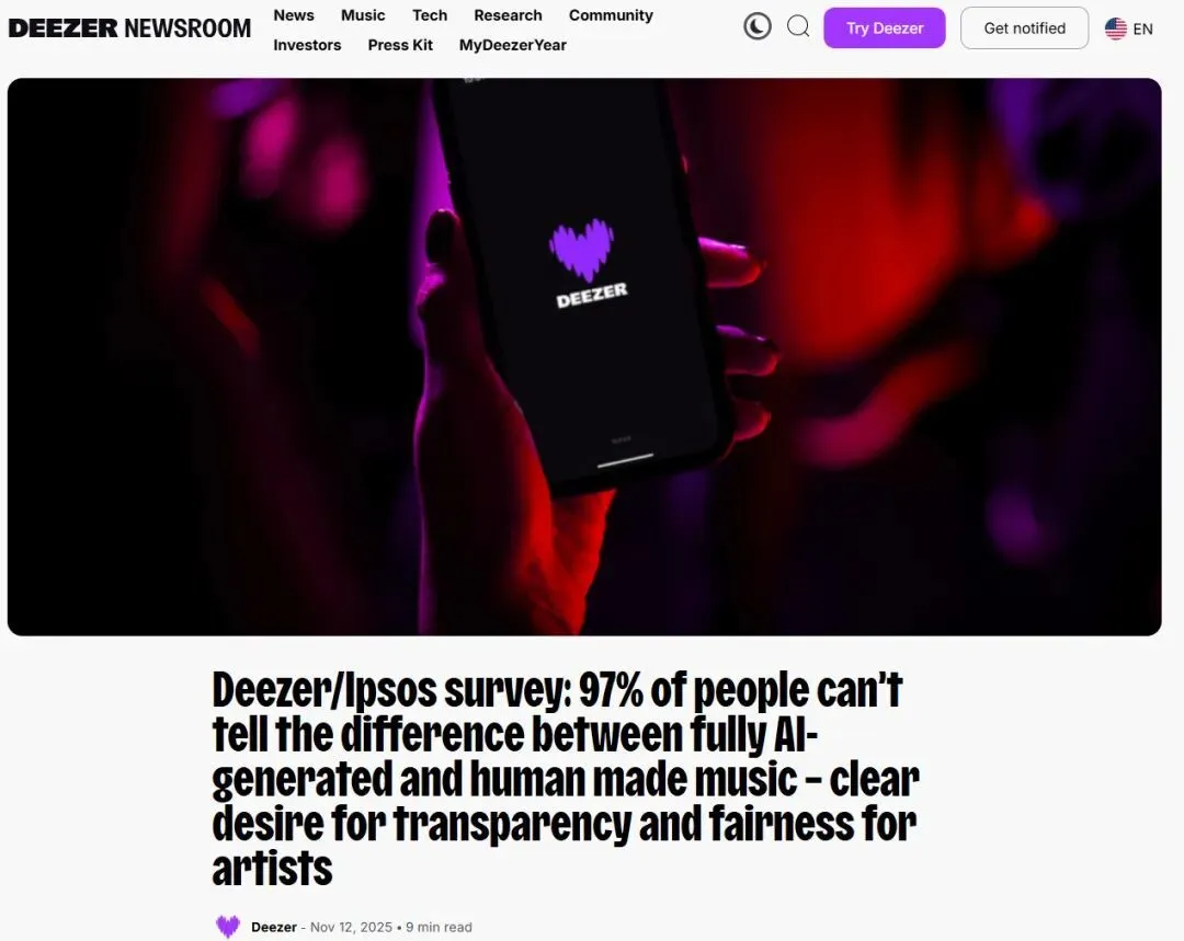 这意味着AI音乐的制作流程专业度和可控性进一步提升,也使作品质量再度提升,“AI味儿”越来越淡,甚至趋近于无。法国音乐流媒体平台Deezer与调研机构益普索2025年11月发布的联合调查报告显示,在法国、英国、加拿大等8个国家的超过9000名受访者中,97%的受访者无法区分AI生成音乐与人类创作作品。