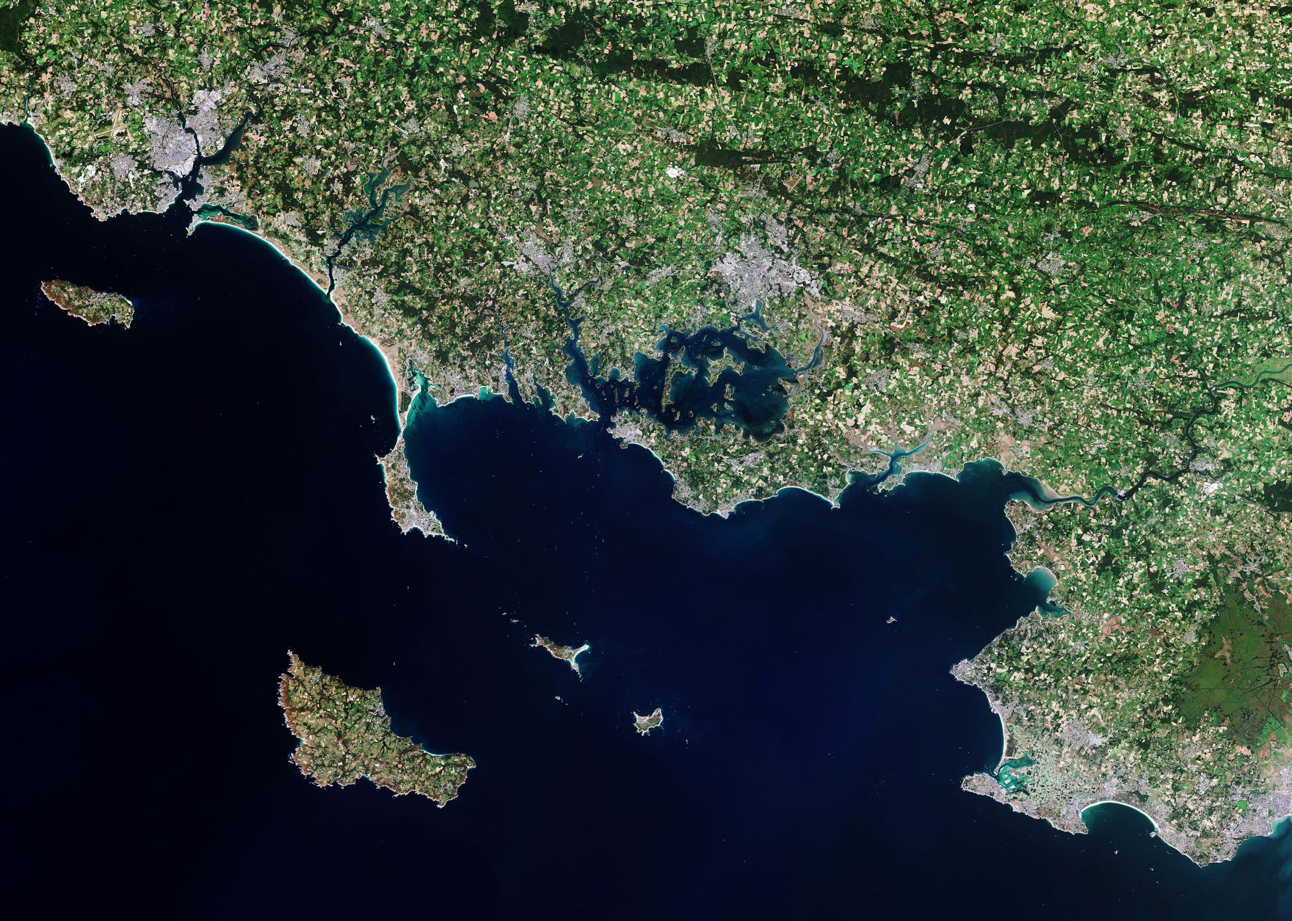 在海湾中可以看到许多船只和船舶。图像中可以看到几个岛屿,包括Houat和Hœdic小岛,以及图像左下方可见的大岛Belle Île。贝勒岛(Belle Île),也称美丽岛因其西南侧可见的尖锐的悬崖边缘而闻名,但也因其海滩和著名的歌剧节而闻名。
