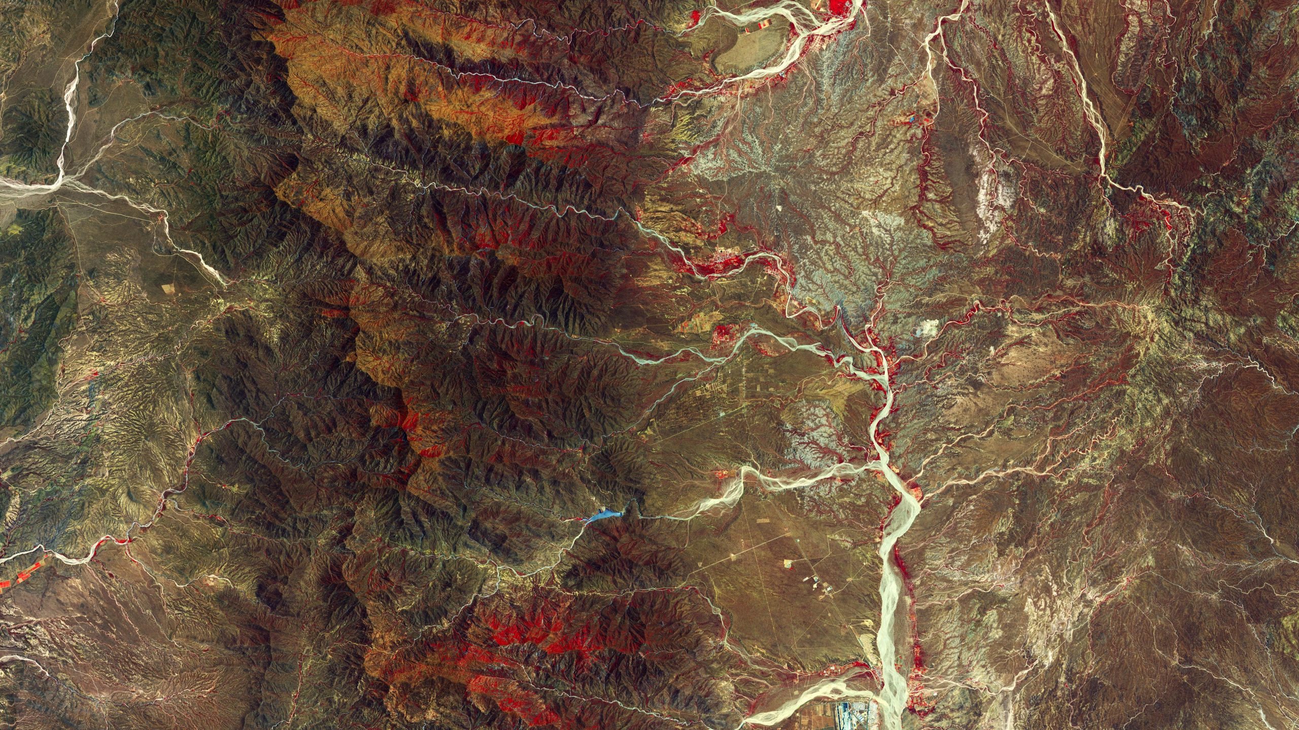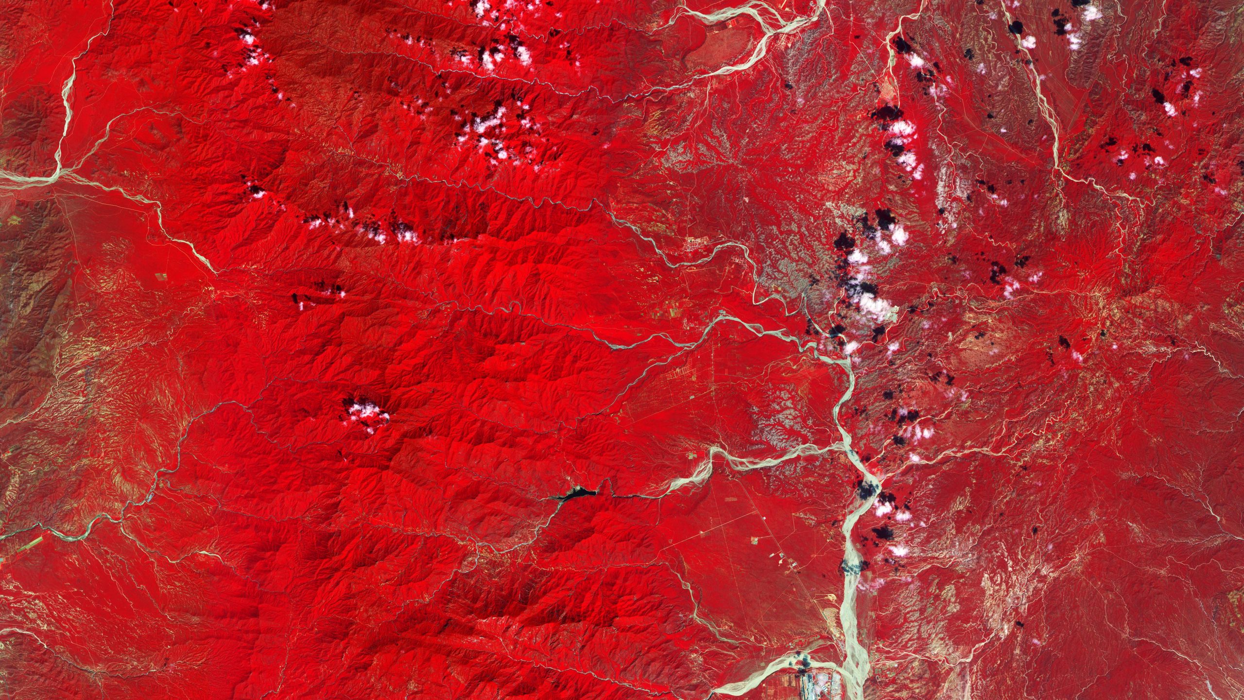 这张图片拍摄于2020年9月28日,正值该地区的雨季,显示了该地区高密度的植被。哨兵2号的这种波段组合最常用于评估植物密度和健康状况,因为植物反射近红外和绿光,同时吸收红光。由于它们反射的近红外光比绿色光更多更密集,因此被植物覆盖的土地在图像中显示为亮红色。