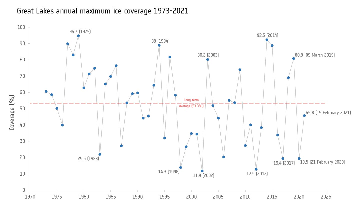 根据气候变化的几种模式,五大湖的冰盖每年都有着巨大的波动。在过去的二十年里,冰层覆盖低于正常水平的年份似乎越来越频繁。上图显示,1979年是冰覆盖率最高的一年,比例达到94.7%;而2002年则是冰覆盖率最低的一年,只有11.8%,这意味着五大湖全年几乎无冰。