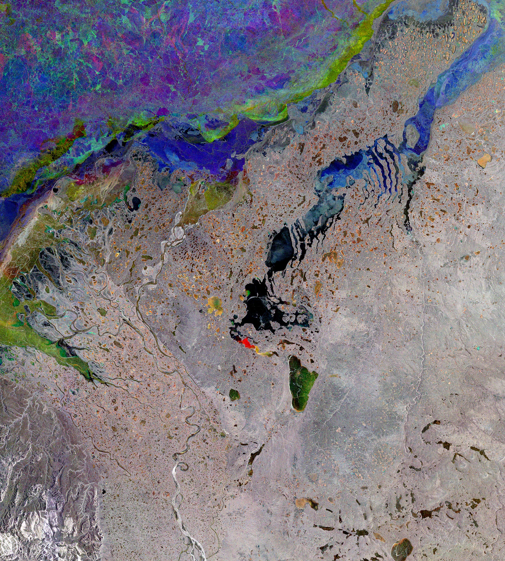 图中的景观是这些纬度地区非常典型的,整个地区受到严酷的冬季气候的影响。许多湖泊在冬季都是冰封的,只有图像中央一些黑色的湖泊是无冰的。其中一个湖泊呈现红色,很可能是由于在图像采集之间新形成的冰。