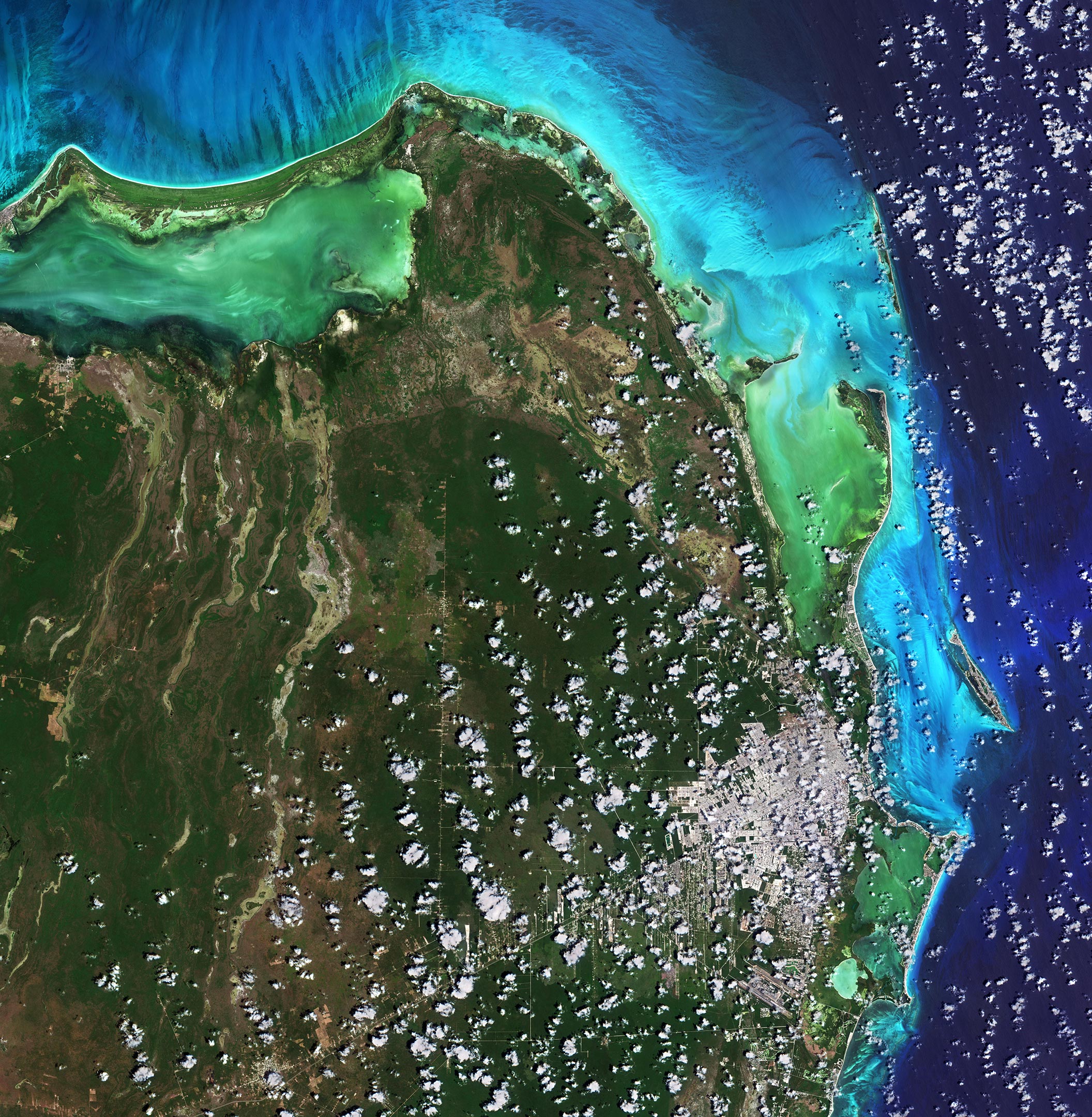 坎昆位于墨西哥尤卡坦半岛东北海岸的金塔纳罗奥州,在哥白尼哨兵2号任务拍摄的这张图片中体现了它的精彩一面。坎昆位于加勒比海边,热带气候和一连串的海滩使该城市和坎昆南部的里维埃拉-玛雅成为墨西哥的顶级旅游目的地之一。