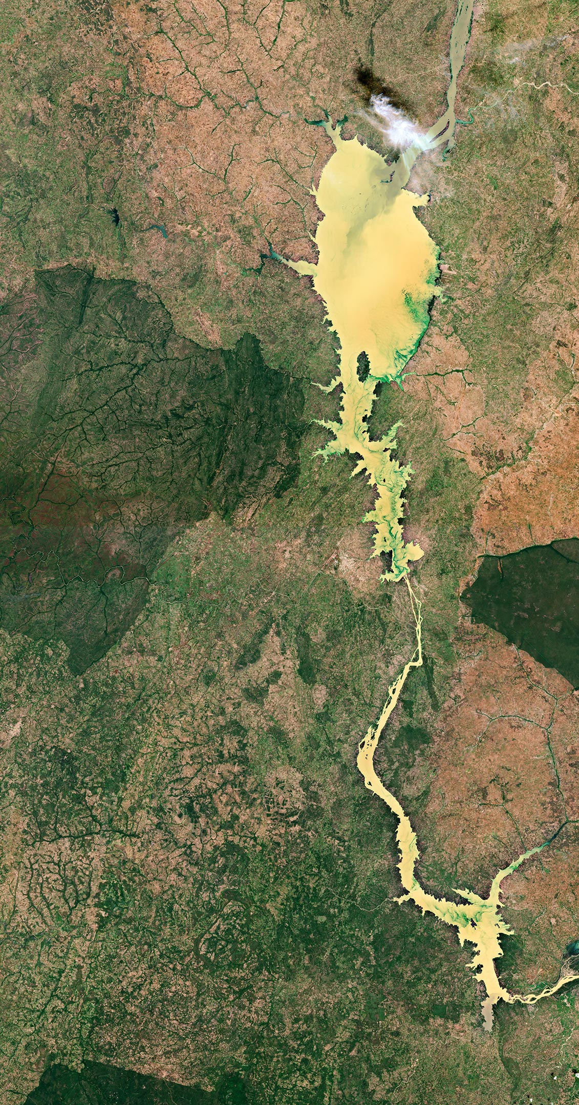 这张由哥白尼哨兵2号任务拍摄的真彩图片显示了尼日利亚西部尼日尔河上的一个水库 - Kainji湖。凯恩吉湖是在1968年通过建造凯恩吉大坝而形成的,面积约为1300平方公里,平均深度为12米。来自非洲第三长河尼日尔河的水在北部进入湖中。