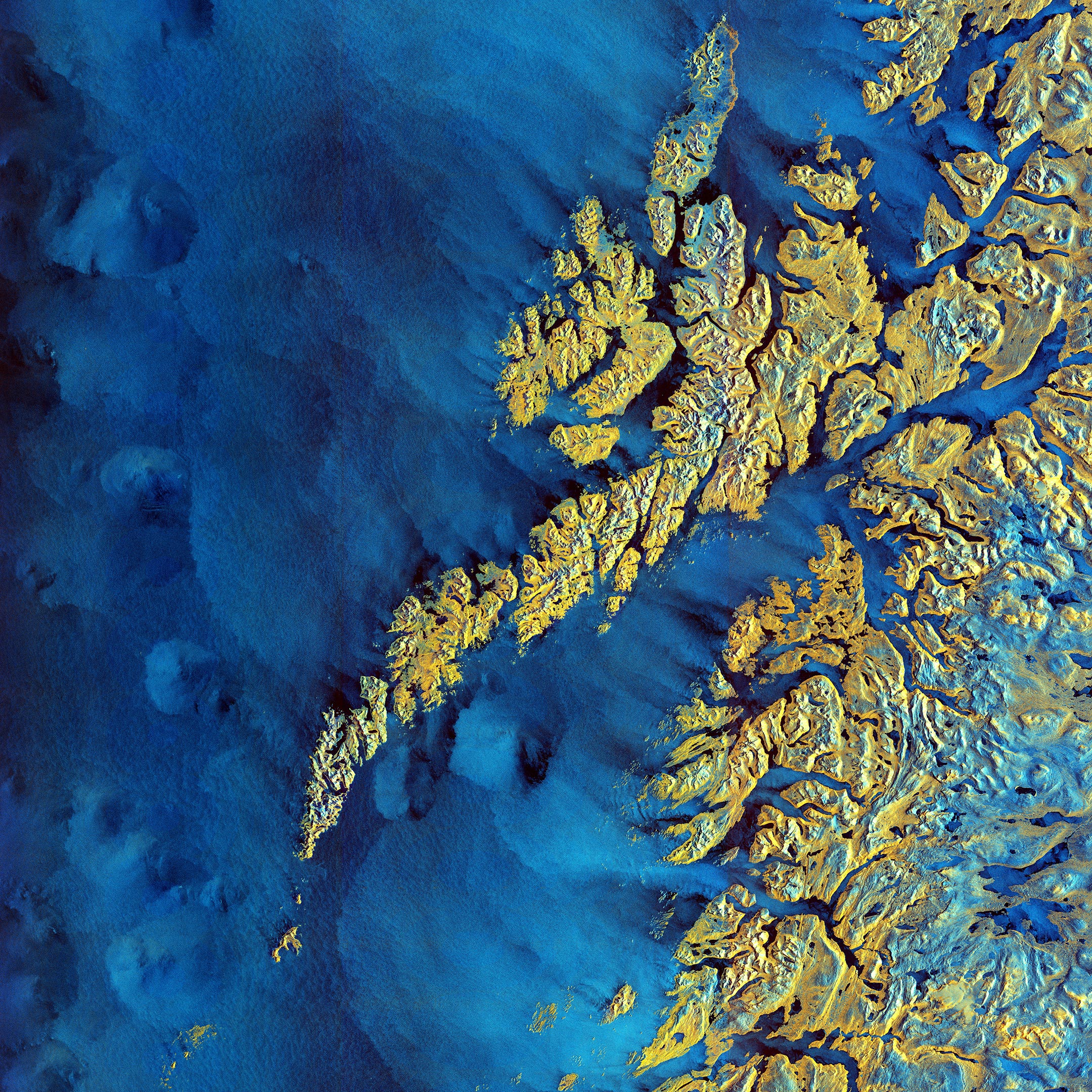 本周图像的颜色来自哥白尼哨兵一号任务的两个"极化"的组合,它们被转换为一张图像。这种遥感技术使我们能够检测到极化之间差异较大的地方。这些差异在图像的蓝色阴影中可见,如波涛汹涌的挪威海、湿地和沼泽,如安岛北端的湿地和山顶上的湿雪(图像的右下角)。黄色显示的是极化之间差异较小的地方,如森林和其他植被的土地,以及建筑区。