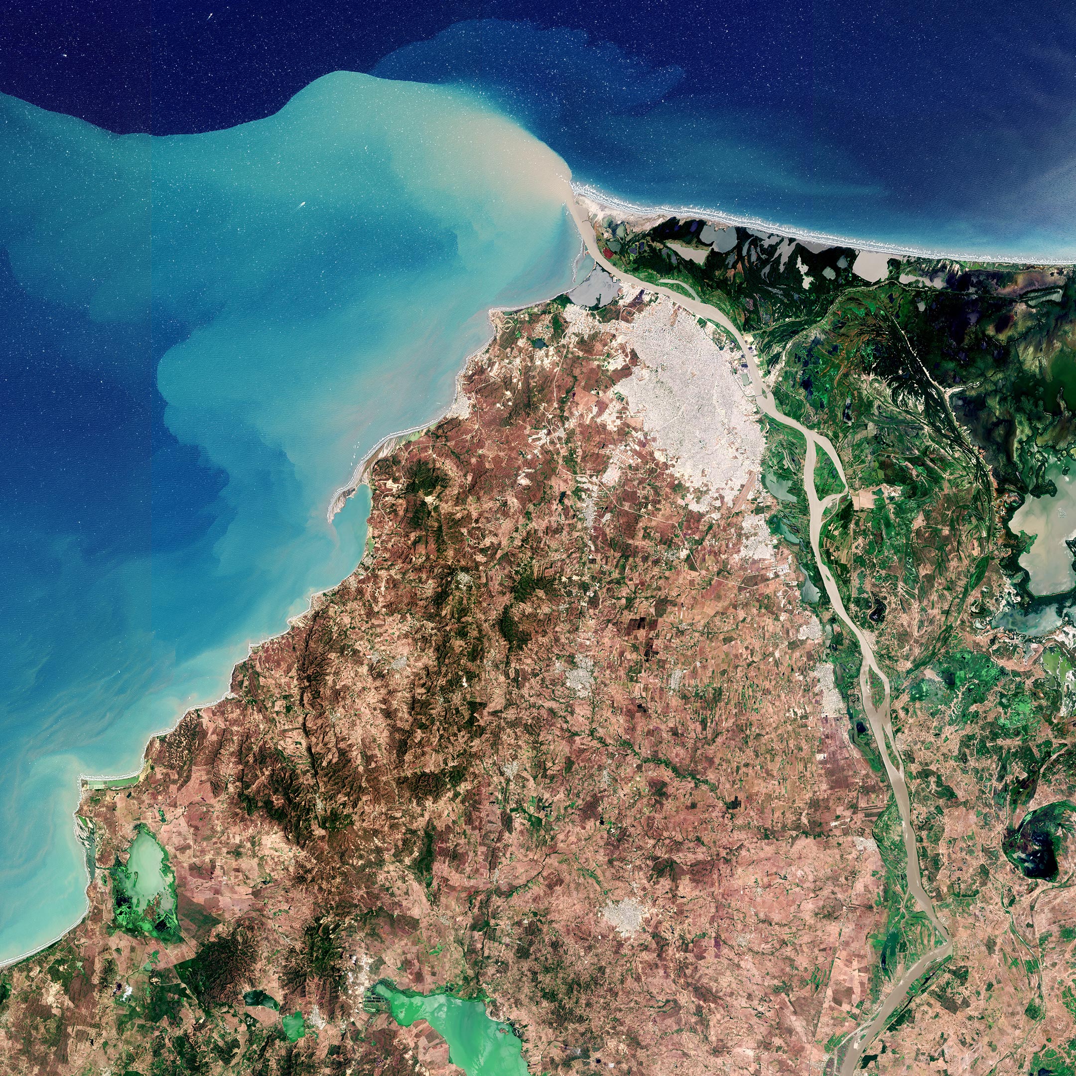 该城市位于马格达莱纳河三角洲的战略位置,马格达莱纳河是哥伦比亚的主要河流之一,向北流经该国西半部约1500公里,然后流入加勒比海。由于大量的沉积物,从河口广泛的沉积物羽流和河水的褐色可以看出,马格达莱纳河需要经常疏浚其主航道,以使远洋船舶能够进入巴兰基亚港口。这张图片拍摄于2021年3月,是在4月开始的雨季来临之前拍摄的。