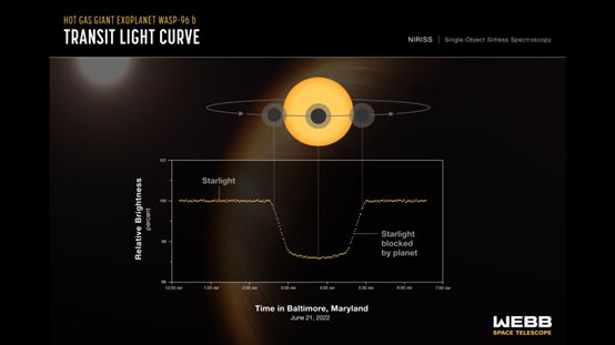 韦布测出的WASP-96的光变曲线。根据其亮度的周期性降低,可以推断出有一颗行星围绕着它运转并遮挡了它的部分光,这颗系外行星就是WASP-96b。图片来源:NASA, ESA, CSA, STScI
