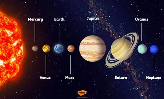 太阳与太阳系内的八大行星的“全家福”。从左到右依次是:太阳(部分)、水星(Mercury)、金星(Venus)、地球(Earth)、火星(Mars)、木星(Jupiter)、土星(Saturn)、天王星(Uranus)与海王星(Neptune),各天体的大小与相互之间的距离未按照比例显示。图片来源:twinkl