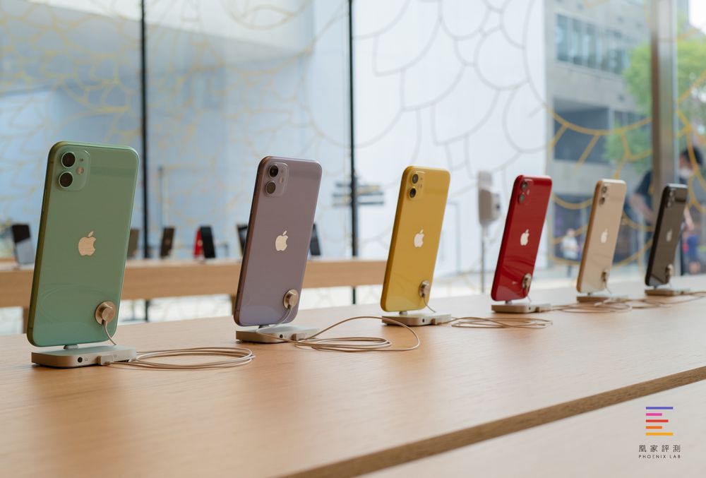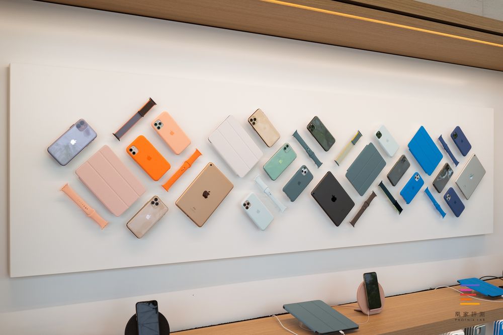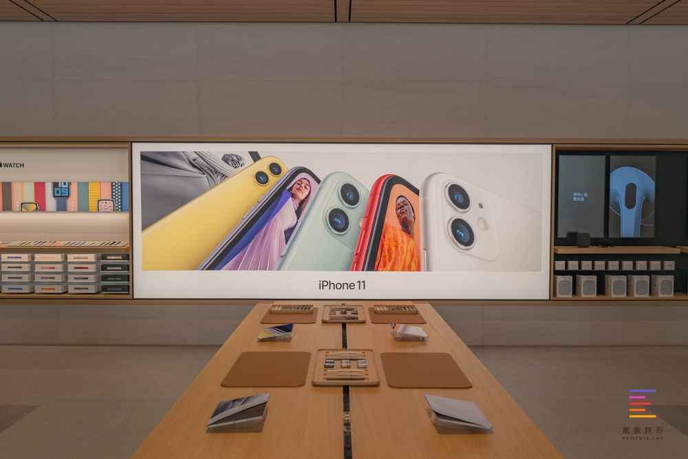 在正对门的桌子上陈列着目前在售的所有iPhone机型,供顾客体验与选购。