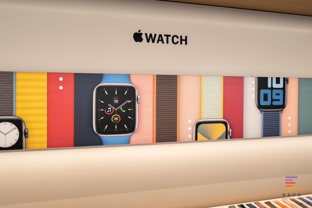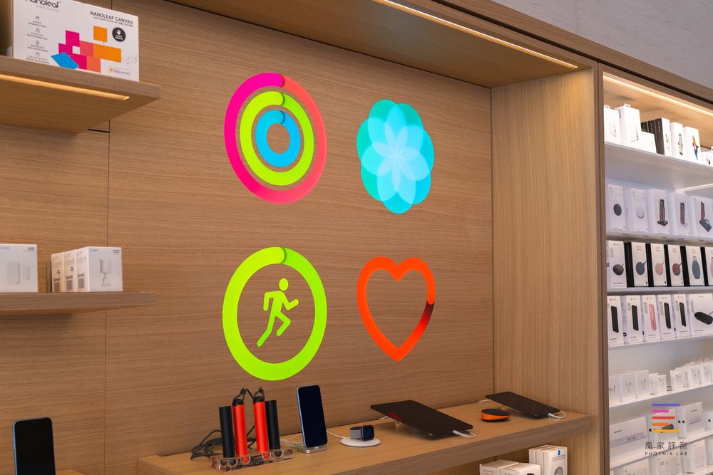 在一层靠墙位置是 Apple Watch桌,紧挨海报灯箱与配件墙