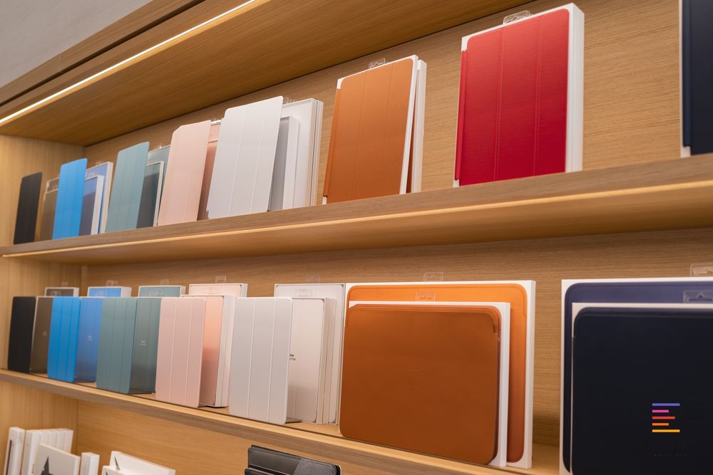 在墙上展示iPad与Mac的保护配件。