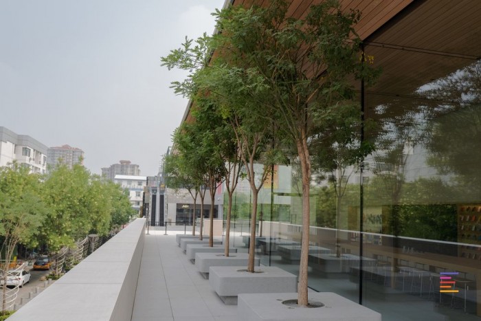 二层露台种有北京市市树——国槐,用于固定树木的基座方便顾客休息。