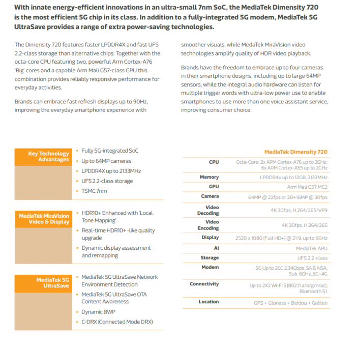 今天上午(7月23日),联发科宣布推出新款5G SoC(单芯片产品)天玑720。规格方面,天玑720采用台积电7nm工艺打造,CPU 8核设计,大核是两颗2GHz的Cortex-A76,小核是6颗2GHz的Cortex-A55,GPU集成Mali-G57 MC3,支持最高12GB LPDDR4X-2133内存、UFS 2.2闪存等。