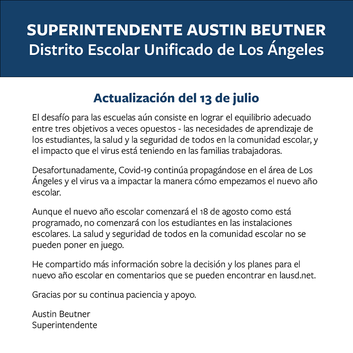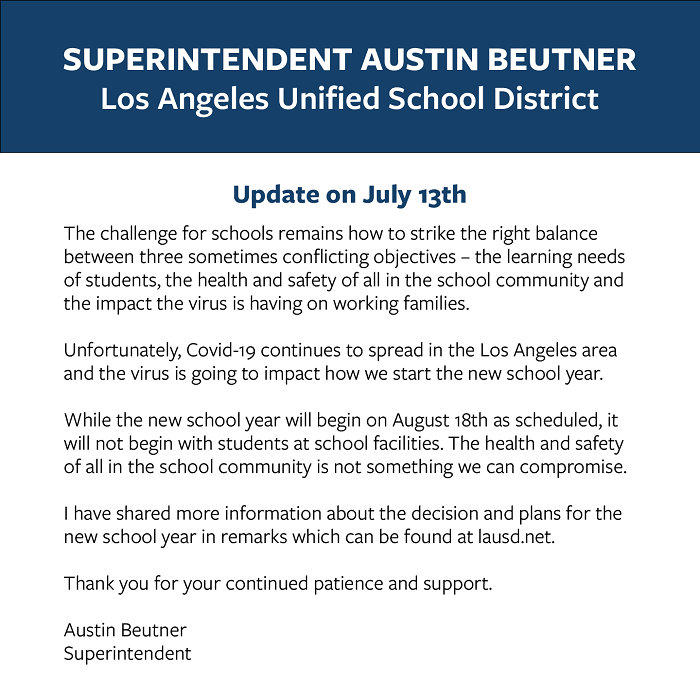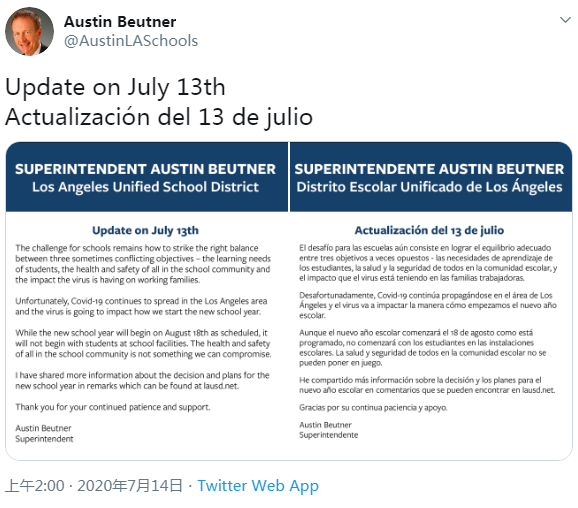 受 COVID-19 疫病大流行的影响,加州两大公立学区已宣布将在秋季学期启用纯线上教学模式。洛杉矶学区负责人 Austin Beutner 在周一的一条推文中透露,当地学生将于下月开始线上学习。他遗憾地表示,因 COVID-19 在洛杉矶地区持续传播,当地对新学年教学模式的规划也受到了影响。