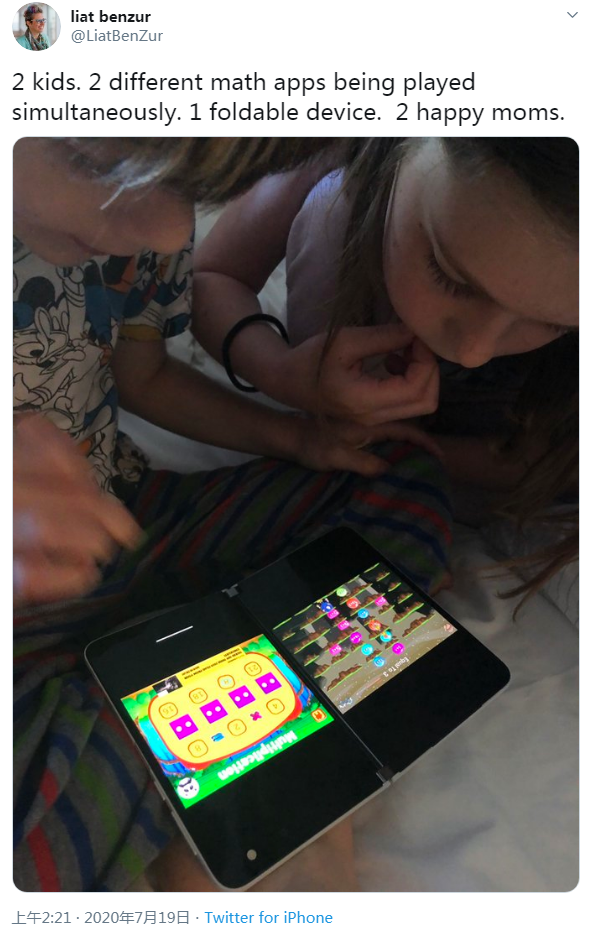随着发布日期的邻近,微软现代生活与设备执行副总裁 Liat Benzur 近日在社交媒体上分享了有关 Surface Duo 的更多细节。几天前发布的图片,展示了这款双屏移动设备的多任务处理功能,比如小朋友们可分别在两块 5.6 英寸的屏幕上玩不同的游戏。相比之下,当前许多移动设备的屏幕仍然太小,不便于执行有更高要求的多任务操作。