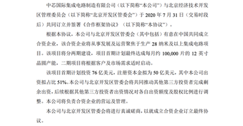 7月31日晚,中芯国际发布公告称,公司与北京开发区管委会订立合作框架文件,双方有意就发展及营运集成电路项目于中国共同成立合资企业。合资企业从事发展及营运的项目将聚焦于生产28纳米及以上集成电路,目标为该项目的首期最终达致每月约10万片12吋晶圆的产能。