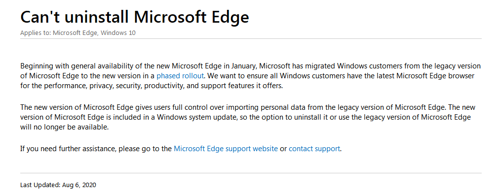 今天微软发布了一篇名为“Can’t uninstall Microsoft Edge”(无法卸载微软Edge)的支持文档,微软表示已经分阶段将 Windows 用户从经典版 Edge 迁移到新版本。