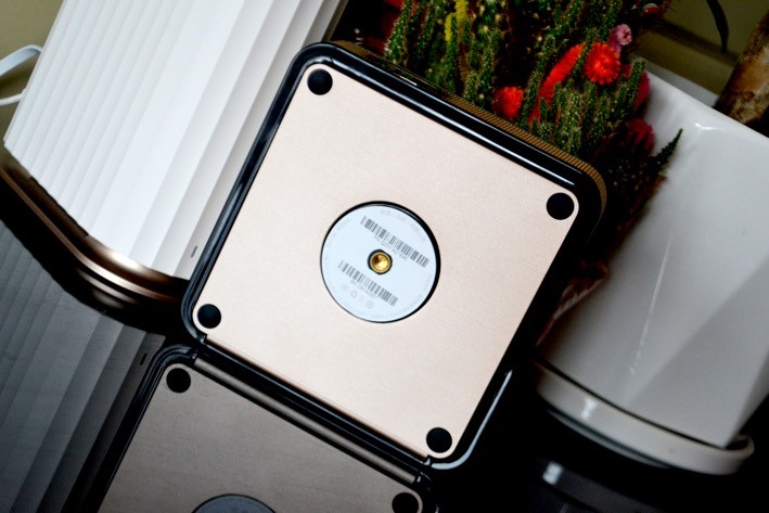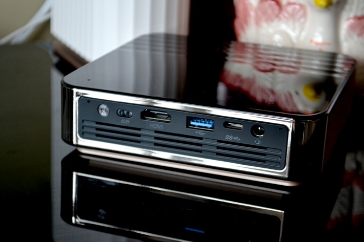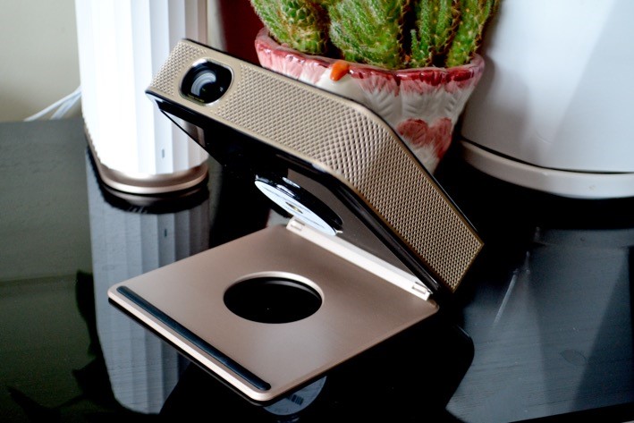 联想智能投影仪Air5整体采用黑金配色,无论摆放在家庭环境还是工作环境中都会显得很上档次,给人一种大气奢华的感觉。其本体仅有5寸大小,具体尺寸为133.6*133.6*37.4mm,重量仅为688g,单手就可以很轻松的将其拿起带走。