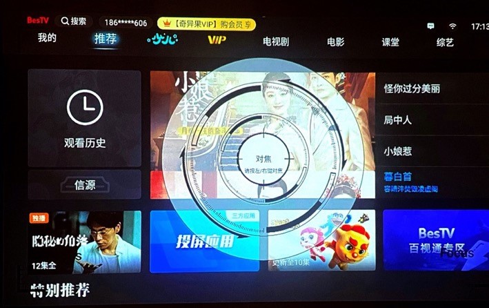 系统方面,联想智能投影仪Air5内置爱奇艺和百视通双系统资源库,内容足够丰富,要是能随产品附带VIP权益无疑会让设备本身更具吸引力,也希望联想能在后续的产品发售中考虑加入。