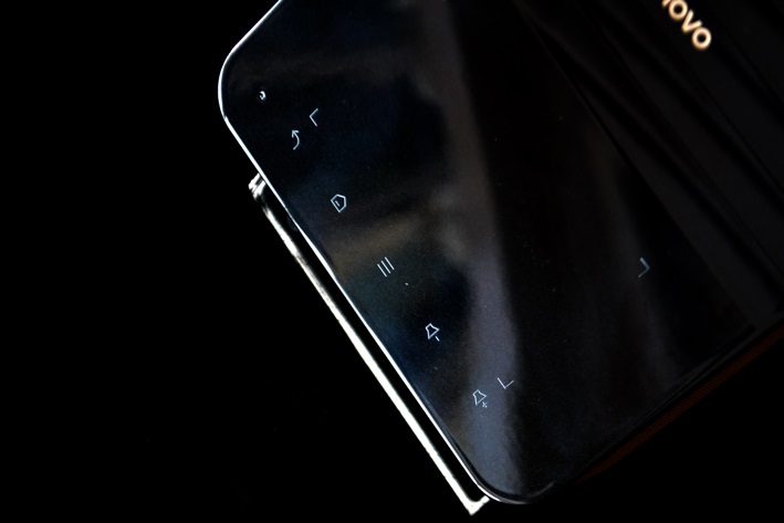 下半部分均为触控区,其中,圈出的长方形区域为触摸控制面板,能够通过触控操作部分代替遥控器的功能。最下方一排是一些最常用到的快捷触控按键,从左到右依次为返回,主页,菜单,音量减小和增大键。