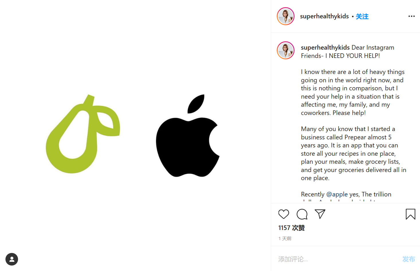 该公司在Instagram上发文称,苹果“决定反对并追讨我们小企业的商标,称我们的梨logo跟他们的苹果logo太接近,而这可能会损害到他们的品牌”。该帖子还称,此举是对Prepear来说是一个重大的打击,公司则还是选择保留原来的logo,与此同时还要向向大型科技公司传达一个信息--即欺凌小企业会造成某些后果。