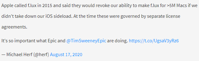 当然,F.lux 不是第一个、也不是最后一个遭到苹果霸凌的开发商。即便遭遇了美国国会的反垄断质询,该公司也丝毫没有收敛地在滥用支配权力来打击异议者。