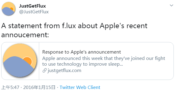 F.lux 公司以同名的应用程序而被人们所熟知,特点是能够帮助调节计算机显示屏在夜间的蓝光水平,以减少对用户睡眠节律的影响。尽管当前大多数主流操作系统都已原生支持这项功能,但身为元老之一、发布于 2009 年的 F.lux 公司,却很少被它们提及。没想到的是,在近日的推特爆料中,早期开发者之一的 Michael Herf,披露他们确实曾与苹果产生过更直接的冲突。
