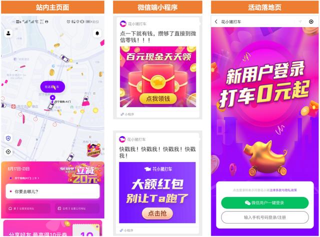 在花小猪应用页面和微信页面,“百元现金”“新用户登陆打车0元”“大额红包”等字样在紫红色背景衬托下极为醒目,为了维系用户粘性并提高活跃度,花小猪采用了和拼多多一样的“签到”“分享”手法,通过病毒式的社交裂变拉新、寻找增量市场,每签到1天即可获得1元打车津贴,连续7天签到可额外获得奖励。