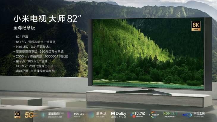 小米电视『大师』82”至尊纪念版定位旗舰,采用82英寸屏幕,10bit面板,7680x4320分辨率,120Hz刷新率,2000nits峰值亮度,400000:1对比度,98%的DCI-P3广色域,采用Mini LED前沿背光技术,集成『星幕锐影背光系统尊享版』,960分区背光系统,支持5G网络,搭载的是Novatek 72685主控芯片,4GB+256GB存储,49999元首发。