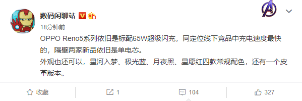 续航方面,Reno5内置了一块4300mAh的电池,支持65W超级闪充,值得注意的是Reno5电池采用的是双电芯设计,而隔壁两家新品依旧采用单电芯设计,此外Reno5也是在定位线下竞品中充电最快的机型。