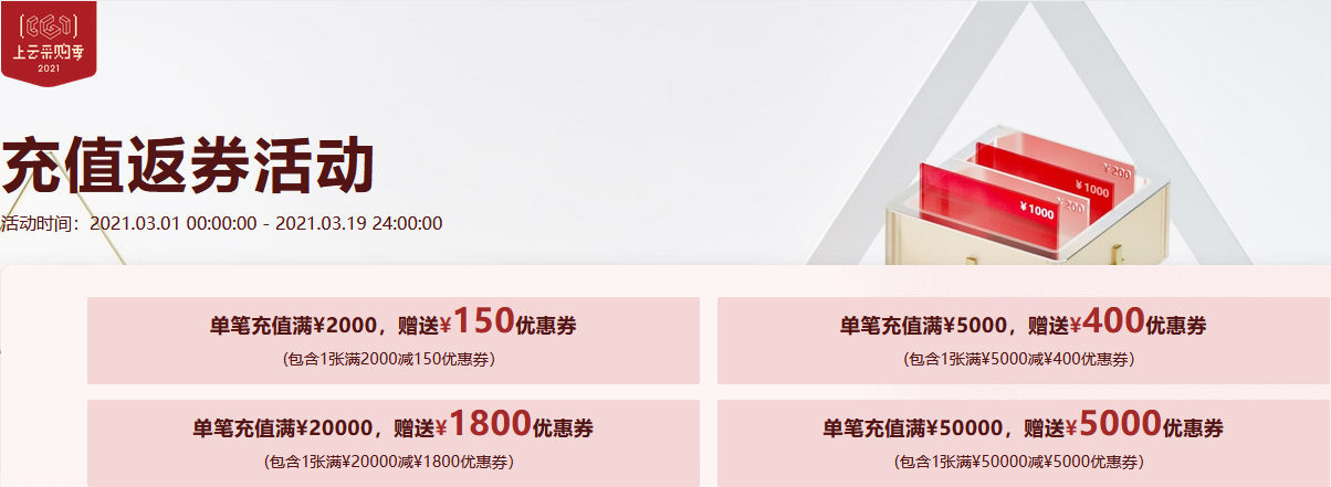 吃完元宵过完年,各行各业都要正式上工了,一年一度的2021阿里云上云场景化企业采购季在这个时间节点准时开始。采购补贴、充值返券、会员专享、新人抢先购等5大亮点横贯整个3月。3月1日至16日是预热领券期,只要访问活动大厅就可以轻松领取最高1600元的直减券,充值返券活动也在当天开始,最高单笔可以获得5000元抵用券。