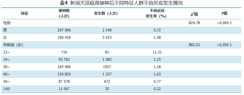 按年龄划分,不良反应发生率最低为≥60岁人群,不良反应发生率为0.32%,其次是30-39岁人群,不良反应发生率为1.18%,12-18周岁人群不良反应发生率最高,为11.31%,以疲劳及接种部位疼痛为主。