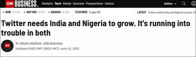 美国有线电视新闻网(CNN)6月13日撰文指出,推特的发展需要印度和尼日利亚,但该公司在两国都遇到了麻烦,一些人担心,既然尼日利亚已经表明不怕封禁推特,那么印度很可能就是下一个封禁推特的国家。