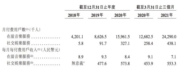 聆讯资料显示,网易云音乐2021年Q1营收15亿元,同比增长74.6%。其中在线音乐板块收入从2020年Q1的5亿元增至8亿元,社交娱乐及其他板块收入从2020年Q1的4亿元增至7亿元。2018-2020年,网易云音乐全年营收分别为11亿元、23亿元、49亿元,连续两年翻番。