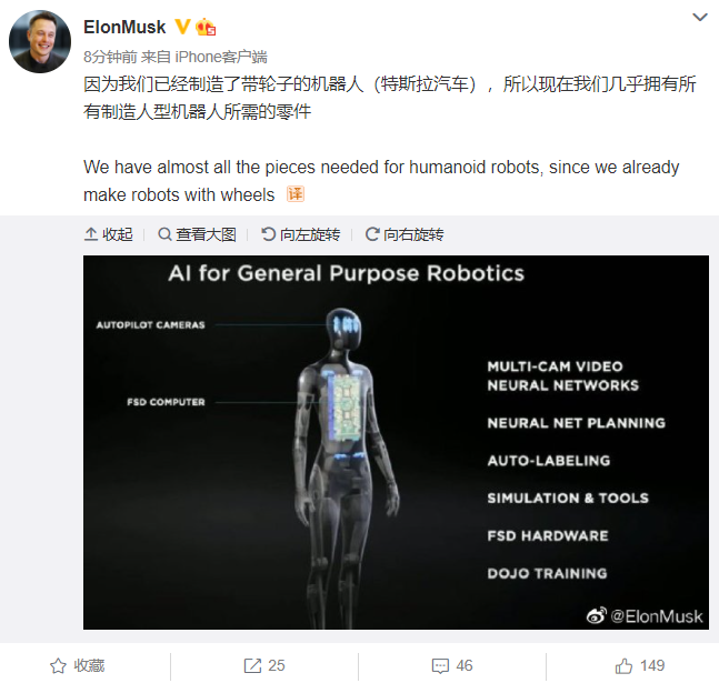 马斯克发微博称:“因为我们已经制造了带轮子的机器人(特斯拉汽车),所以现在我们几乎拥有所有制造人型机器人所需的零件。”