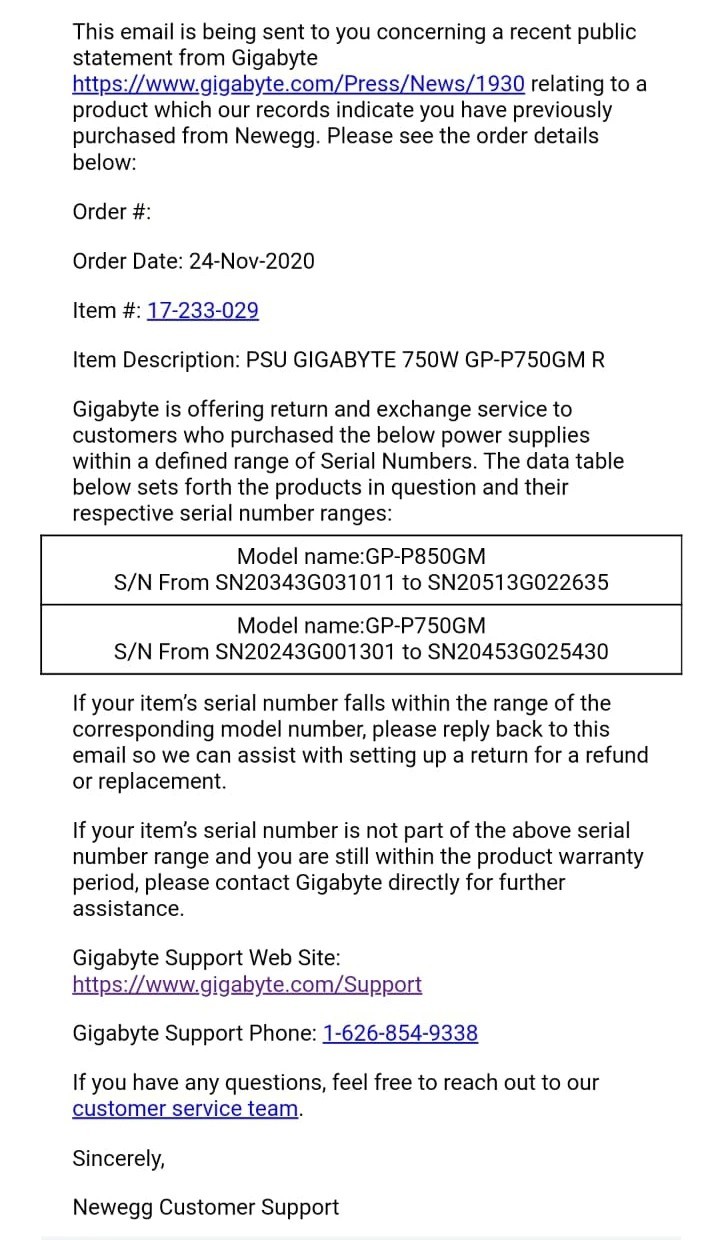 现在,在新蛋公司发出的一封电子邮件中,该零售商巨头已经要求符合条件的客户作出回应,如果他们的技嘉电源型号属于技嘉公司早些时候在其对该事件的官方回应中提到的指定序列号(S/N)内,就可以获得退货、换货服务。