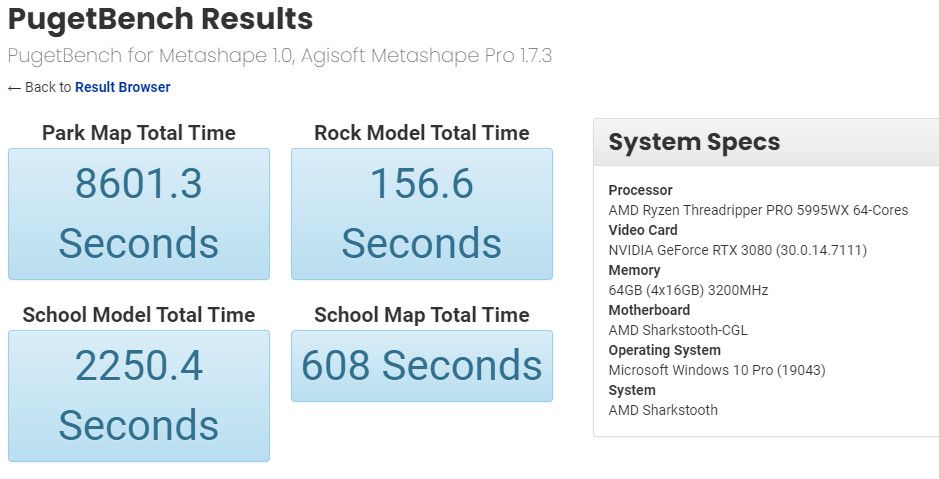 最新基准测试来自于 PugetBench(目前已经删除)。该处理器在摄影测量软件 Agisoft Metashape 10 中接受了测试。5995WX 的测试平台为AMD 参考平台:Sharkstooth-CGL WRX80 主板和 64GB 3200 MHz 内存。
