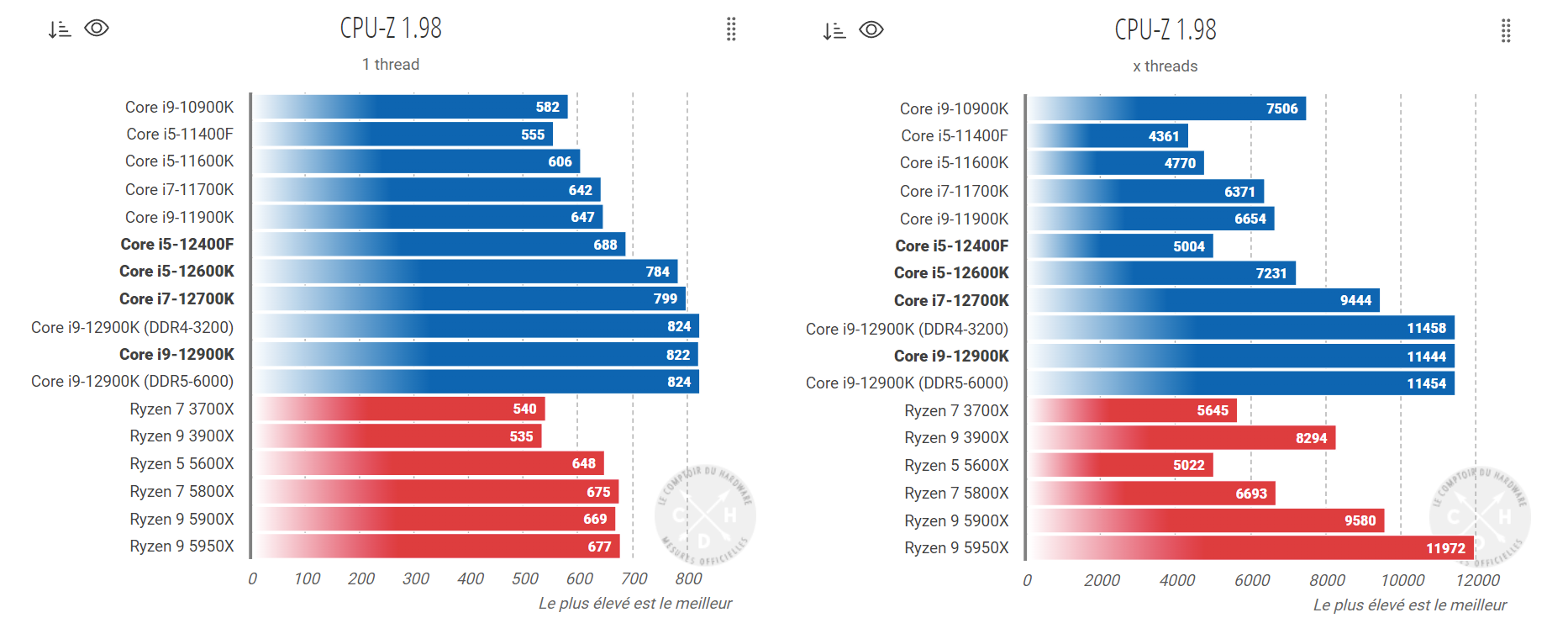 CPU-Z 酷睿 i5-12400F 单核 / 多线程性能对比(图自:Comptoir Hardware)