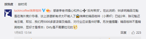 值得一提的是,据媒体报道,此前,当当网创始人李国庆 发布视频,质疑瑞幸购买近半进口量的埃塞俄比亚花魁豆。