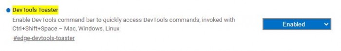 想要启用该功能,用户需要在 Edge Canary 105 及更高版本中,访问 edge://flags 页面,输入 DevTools Toaster 找到该选项将下拉菜单设置为 Enabled。重新浏览器之后你可以使用键盘快捷方式 Ctrl+Shift+Space 呼出 Command Palette 页面了。