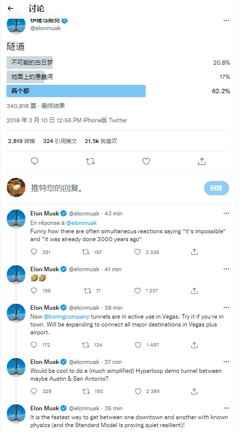 北京时间8月22日消息,马斯克今日发推文,回复了自己在2018年3月发起的有关Boring公司的投票,认为建造隧道以解决交通拥堵这一“不可能的白日梦”已经实现。当时他曾发起投票,询问网友这是“不可能的白日梦”还是“地面上的愚蠢洞”?大部分人对隧道计划持否定意见。4年过去,他打趣回复道:“有趣的是,有很多人同时反应说‘这是不可能的’和‘3000 年前就已经完成了’。”