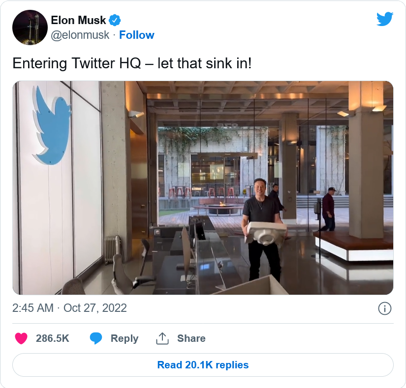 在将自己的简历改"首席推手"(Chief Twit)后不久,埃隆-马斯克发布了一段自己走进Twitter旧金山总部的视频。他写道:"进入Twitter总部,把他们排走!"。视频中,他拿着一个水槽走进办公室,提到了一个多年前的陈旧备忘录,这也是他的一贯作风。