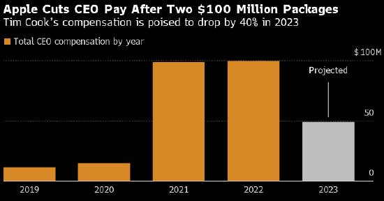 苹果公司将首席执行官库克2023年薪酬总额削减逾40%至4900万美元,主要由于股东的反馈以及库克本人要求调整薪酬。该公司在周四提交的监管文件中称,作为薪酬调整的一部分,2023年授予库克并与苹果公司业绩挂钩的股票激励部分的比例将从50%增加到75%,未来几年也是如此。